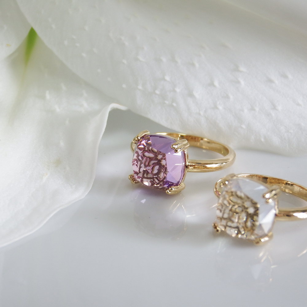 透明なローズカットの水晶をとおして見る透かし模様がまるで万華鏡を覗いているようなリング