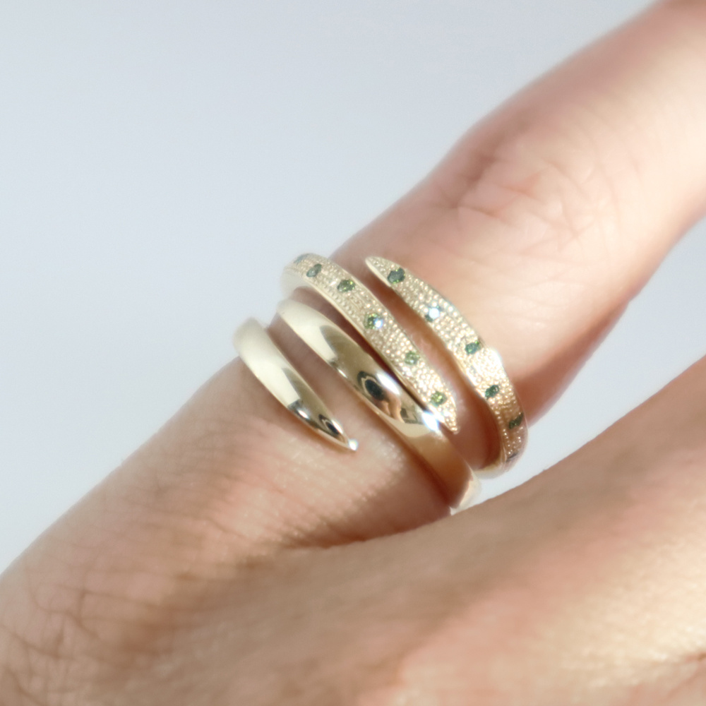 こちらのピンキーリングも鏡面仕上げのプレーンバージョンから、リングの片腕のみグリーンダイヤを蛇の鱗のように石留め、そしてリングの両腕にダイヤモンドが入るバージョンと進化していきます。