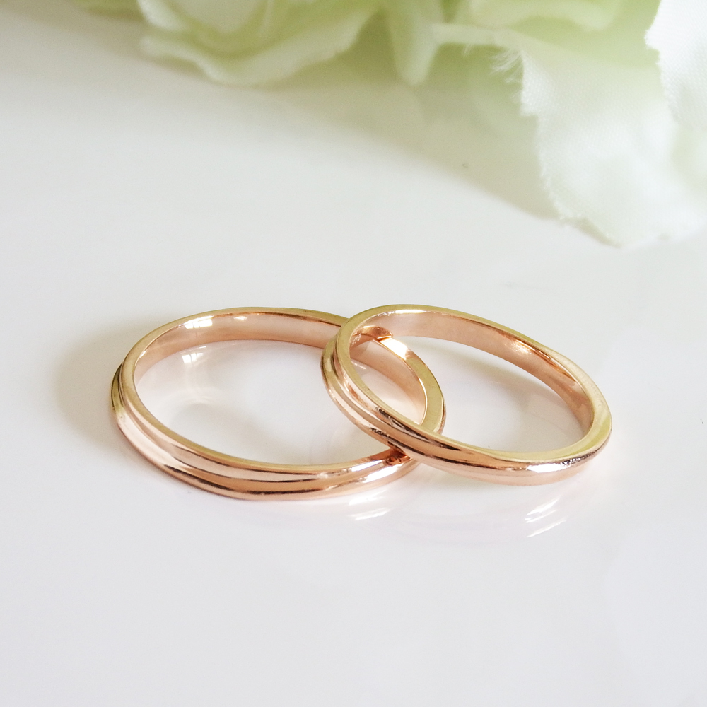ご結婚の際のプラチナのシンプルな結婚指輪に重ね付けをしたいということで、こちらは少し細めの1.5mm幅の流線デザインのピンクゴールドの結婚指輪をお作りしました。
